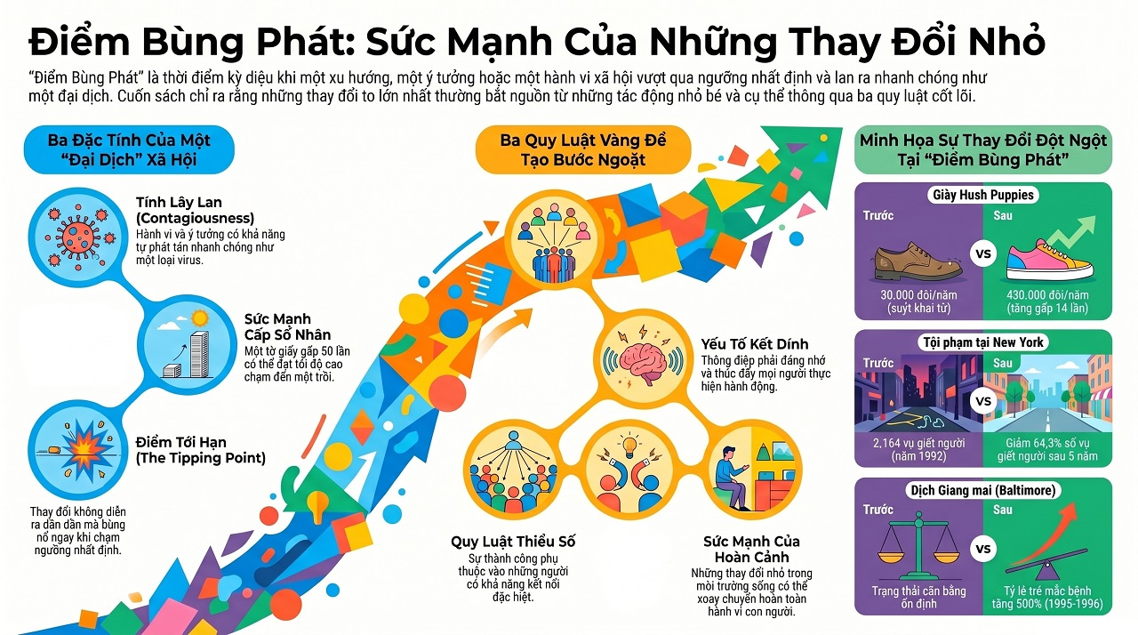 “Điểm Bùng Phát” (The Tipping Point) trình bày một quan điểm mang tính cách mạng về cách các ý tưởng, sản phẩm, thông điệp và hành vi lan truyền trong xã hội. Thay vì diễn tiến theo một đường thẳng ổn định và dự đoán được, các hiện tượng xã hội vận động tương tự như một đại dịch: chúng có thể bùng phát mạnh mẽ từ những yếu tố nhỏ bé và vụn vặt nhất.