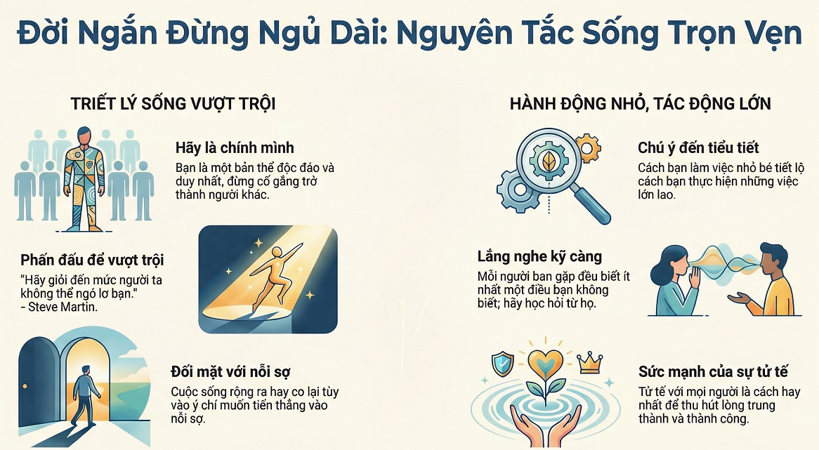 Bài viết này Webtietkiem tổng hợp những hiểu biết cốt lõi và triết lý sống từ tác phẩm “Đời Ngắn Đừng Ngủ Dài” của tác giả Robin Sharma. Thông điệp trung tâm của cuốn sách xoay quanh tư tưởng “lãnh đạo không cần chức danh” và việc khai phóng năng lực tối đa của mỗi cá nhân. Tác giả khẳng định rằng cuộc đời trôi qua rất nhanh, vì vậy con người cần thức tỉnh, từ bỏ sự trì hoãn và nỗi sợ hãi để sống một cuộc đời vĩ đại. Những yếu tố then chốt để đạt được sự vượt trội bao gồm: kỷ luật cá nhân, sự đơn giản, khả năng thực thi ý tưởng, lòng biết ơn và việc xây dựng những thói quen tích cực hàng ngày.