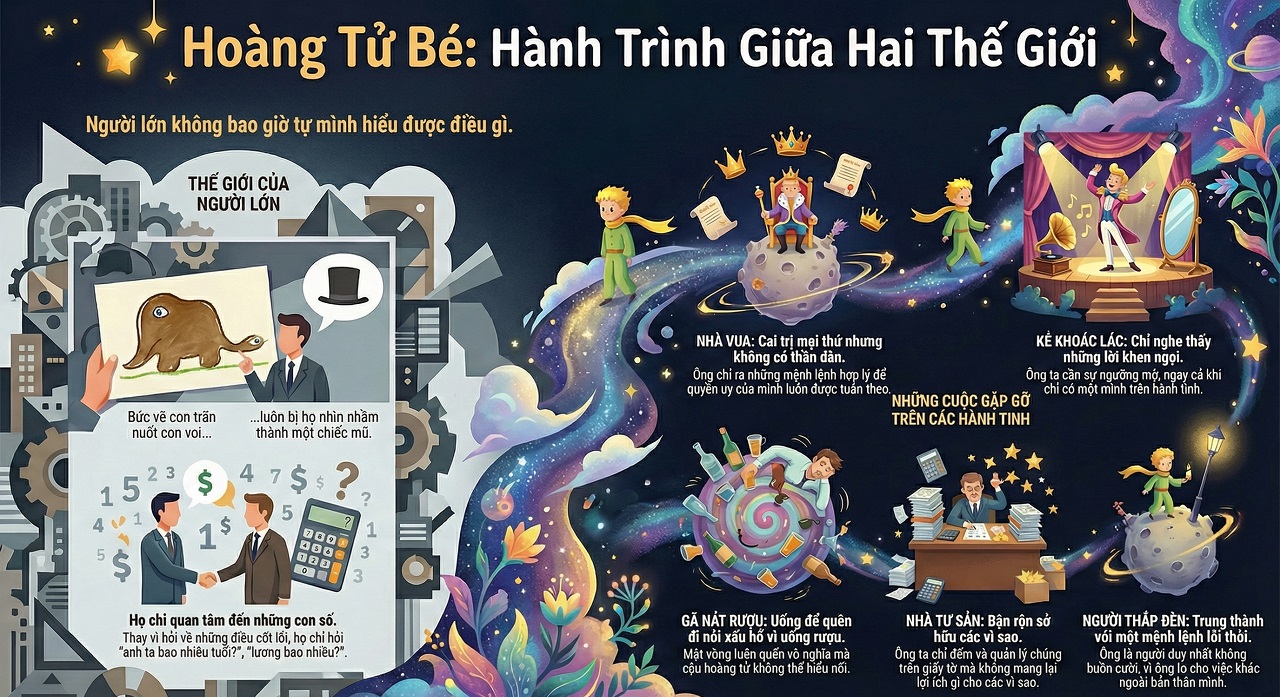 Chuyến du hành của hoàng tử bé qua sáu tiểu tinh cầu là một chuỗi ngụ ngôn châm biếm về sự phi lý của thế giới người lớn.