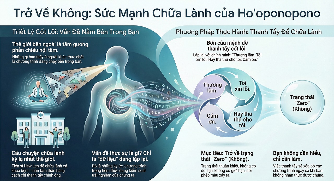 Phương pháp Ho’oponopono được mô tả trong “Trở Về Không” không phải là một công cụ để thay đổi người khác, mà là một hành trình trở về với chính mình. Bằng cách nhận trách nhiệm 100% và liên tục thanh tẩy, cá nhân có thể thoát khỏi sự kìm kẹp của ký ức và sống trong trạng thái thuần khiết của Siêu nhiên, nơi những phép mầu có thể tự nhiên xảy đến.